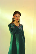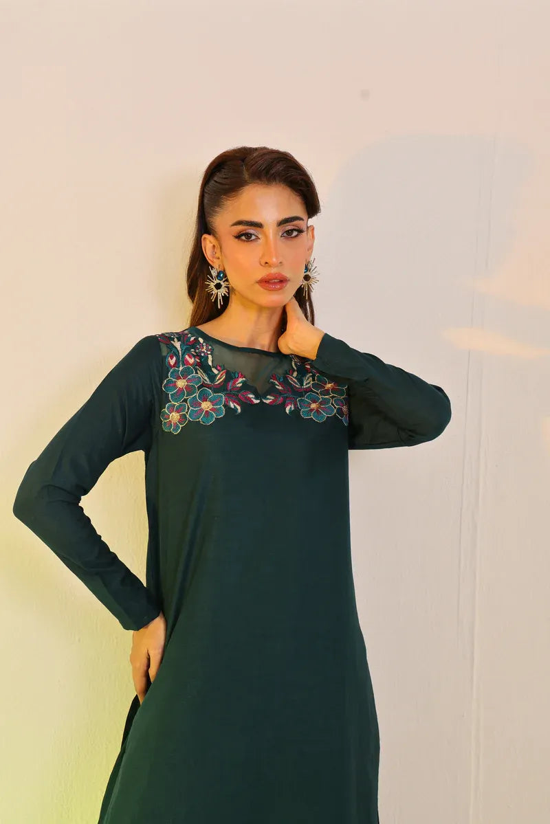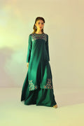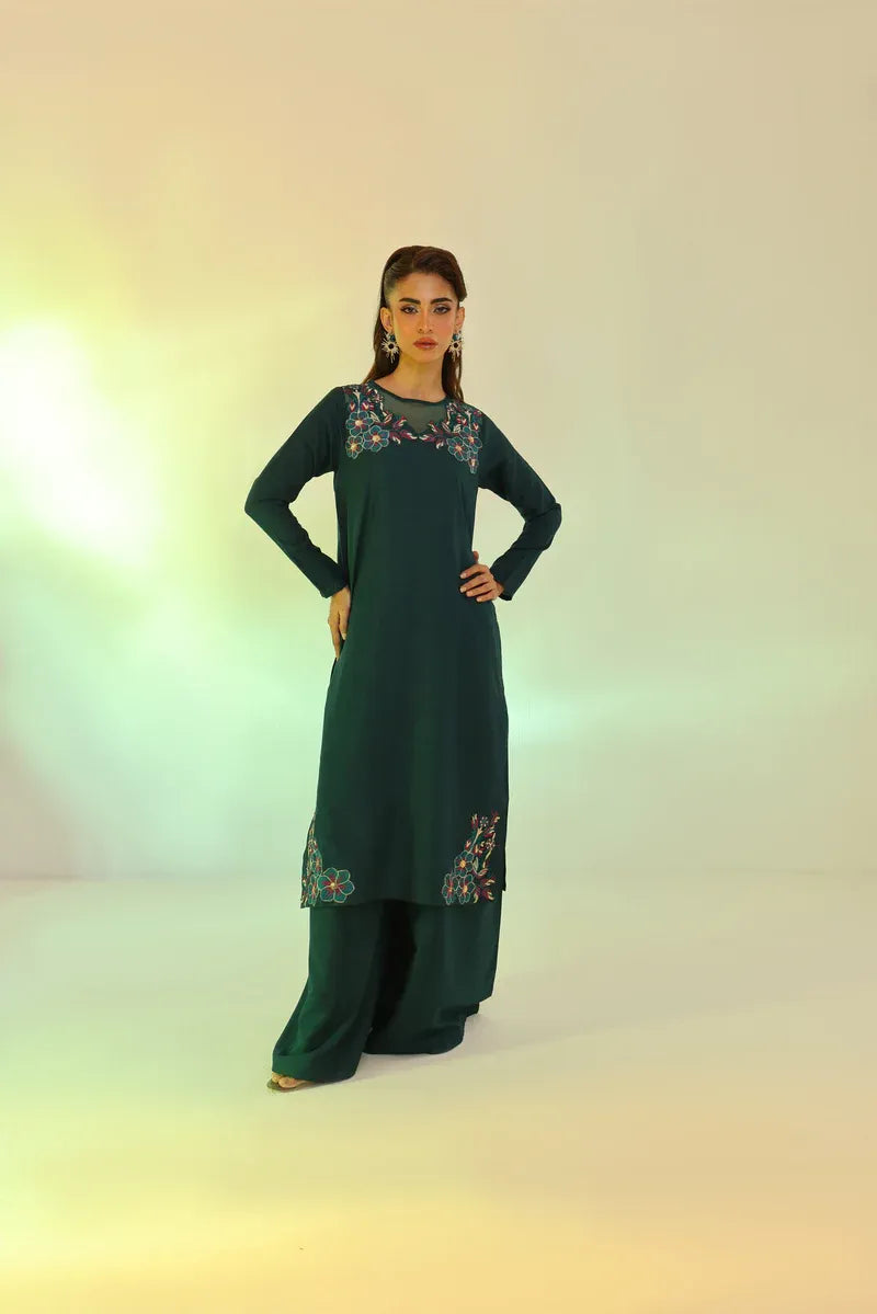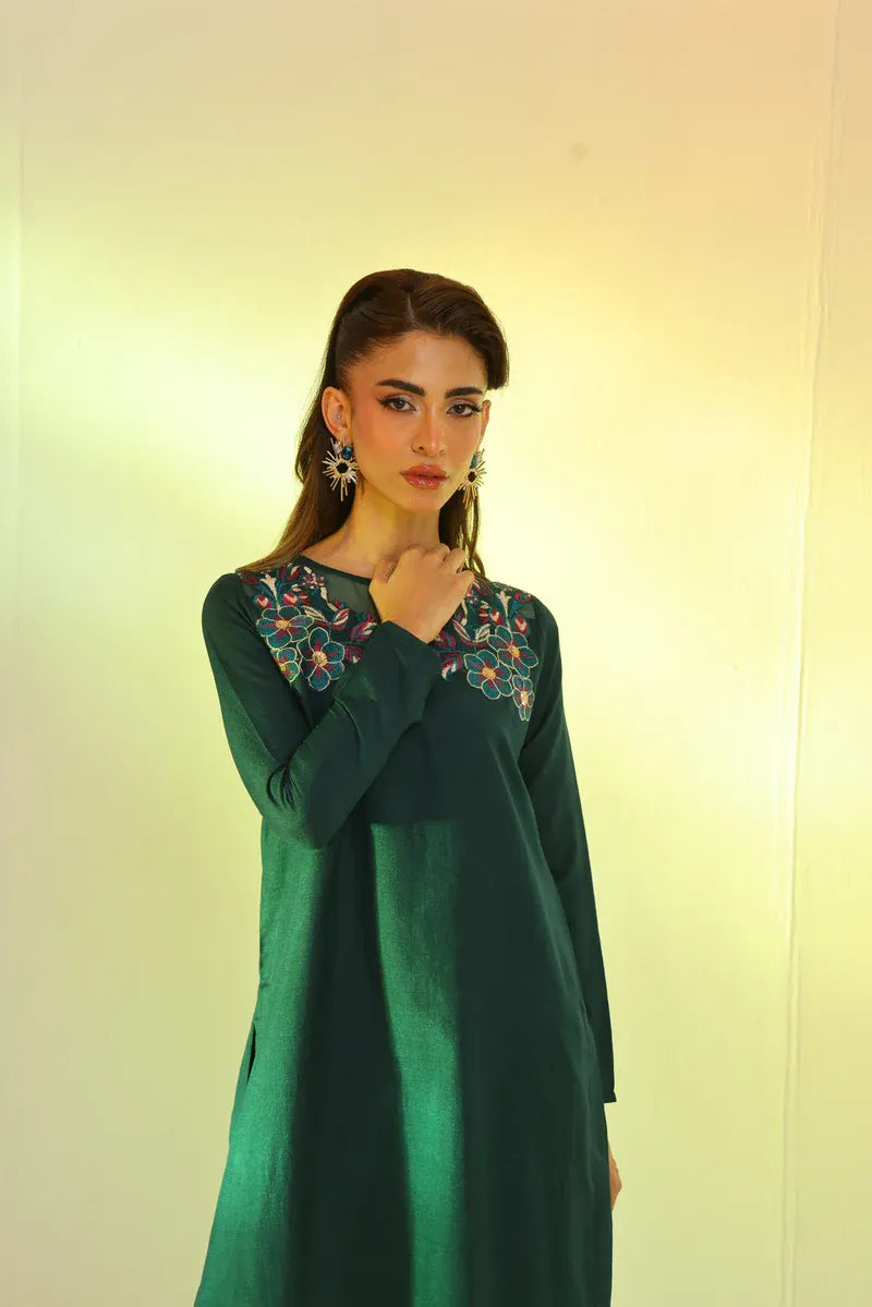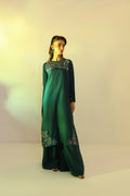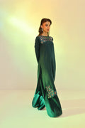 This chic 2-piece set features an embroidered long shirt with full sleeves, paired with flared dhaka pants. Crafted from luxurious Russian silk, the outfit is accented with a hint of pink for a ravishing, trendy look.