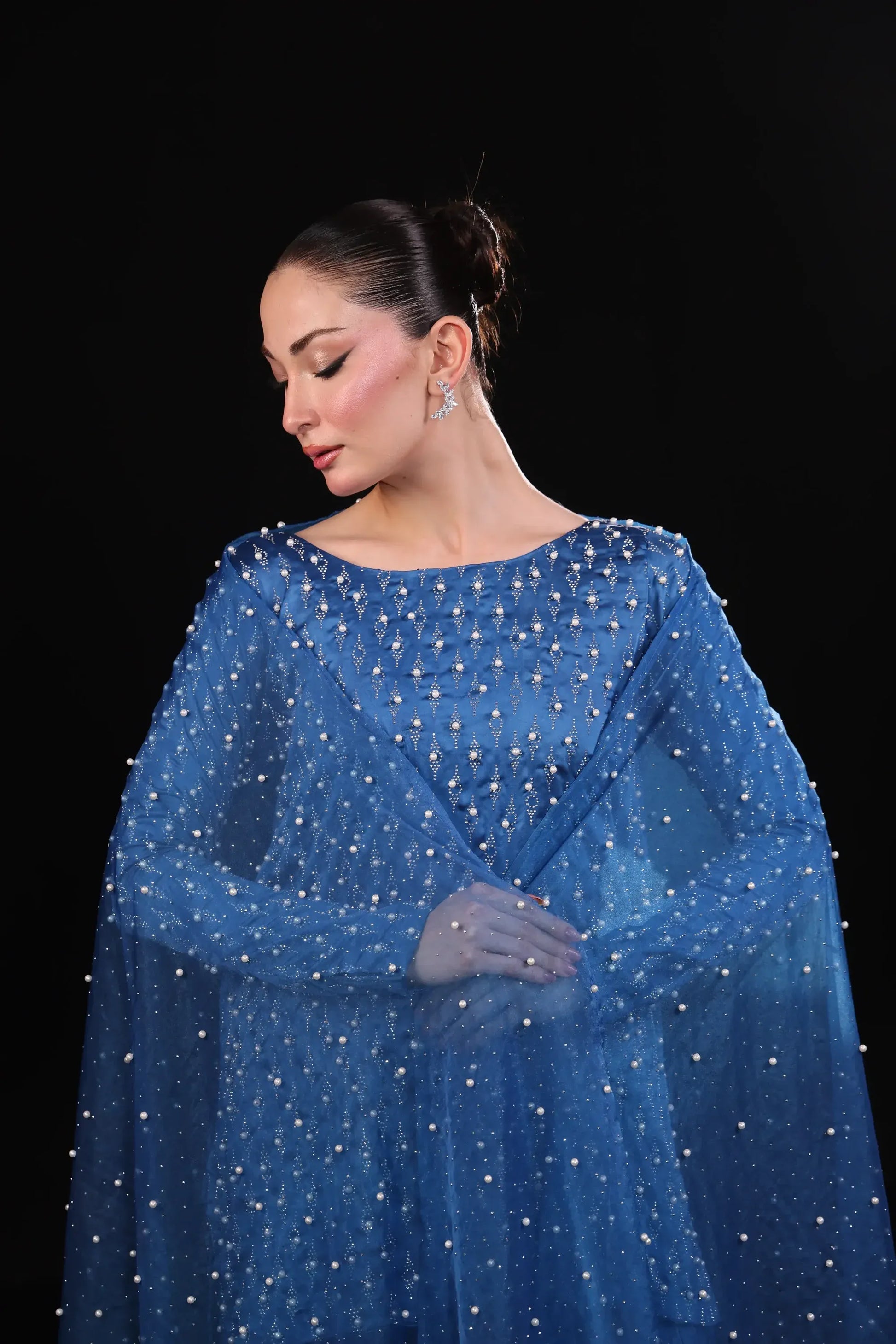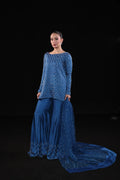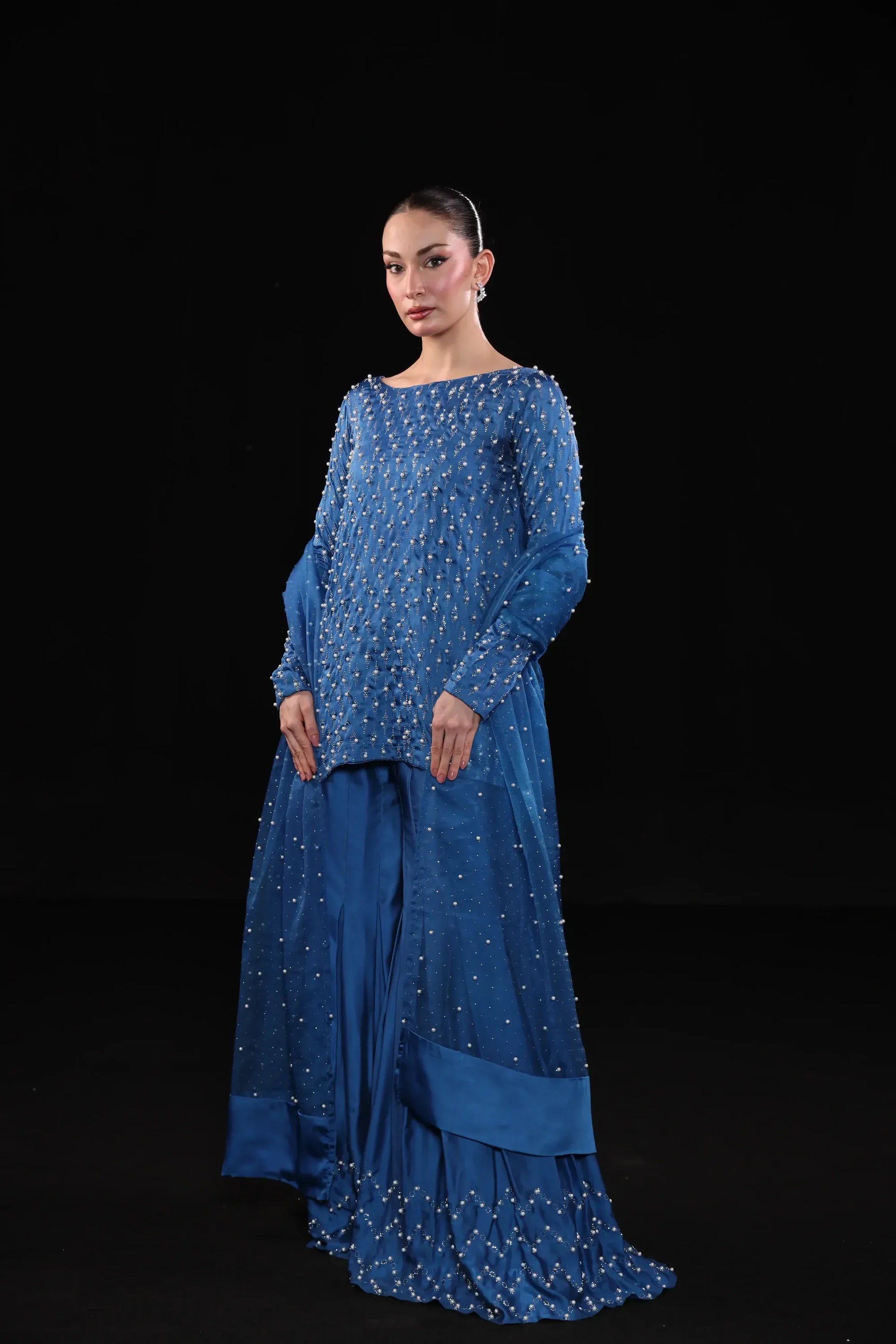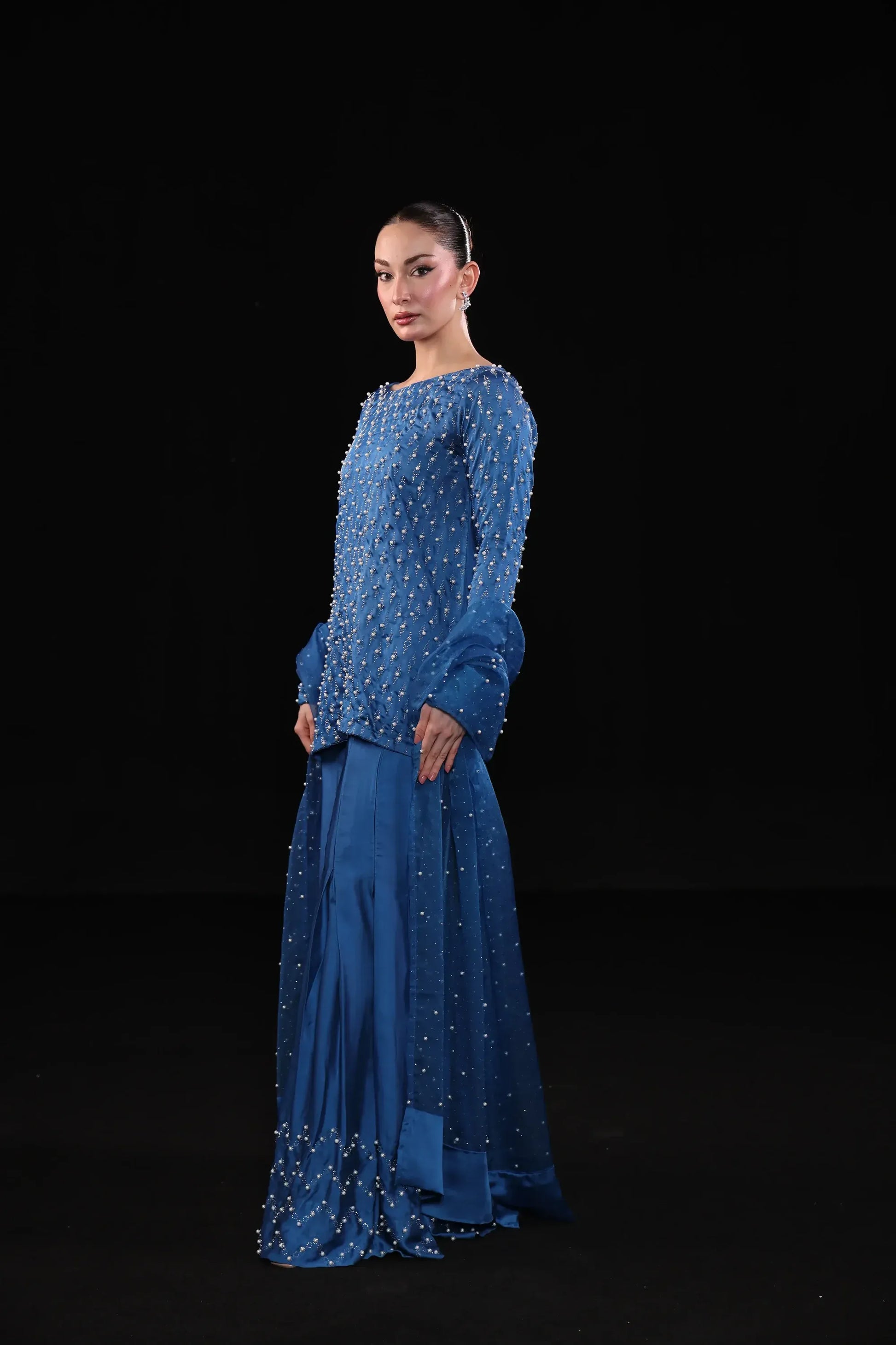 The Muse embodies effortless elegance with artistic flair. Crafted in a captivating teal tone, the pleated Dhaka pants add graceful movement, while the short length shirt dazzles with all over rhinestone and pearl embellishment. Finished with an intricately embroidered organza dupatta and matching details on the pants, this look is made for the woman who inspires simply by being herself.