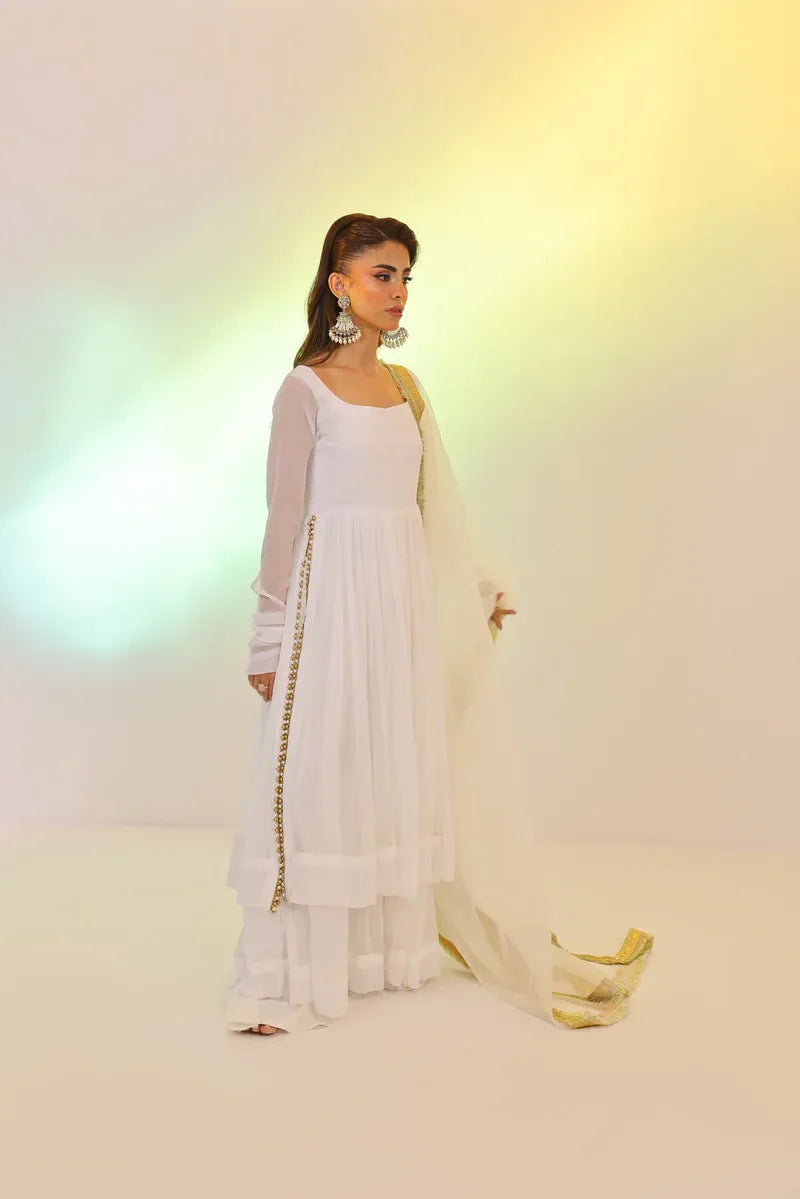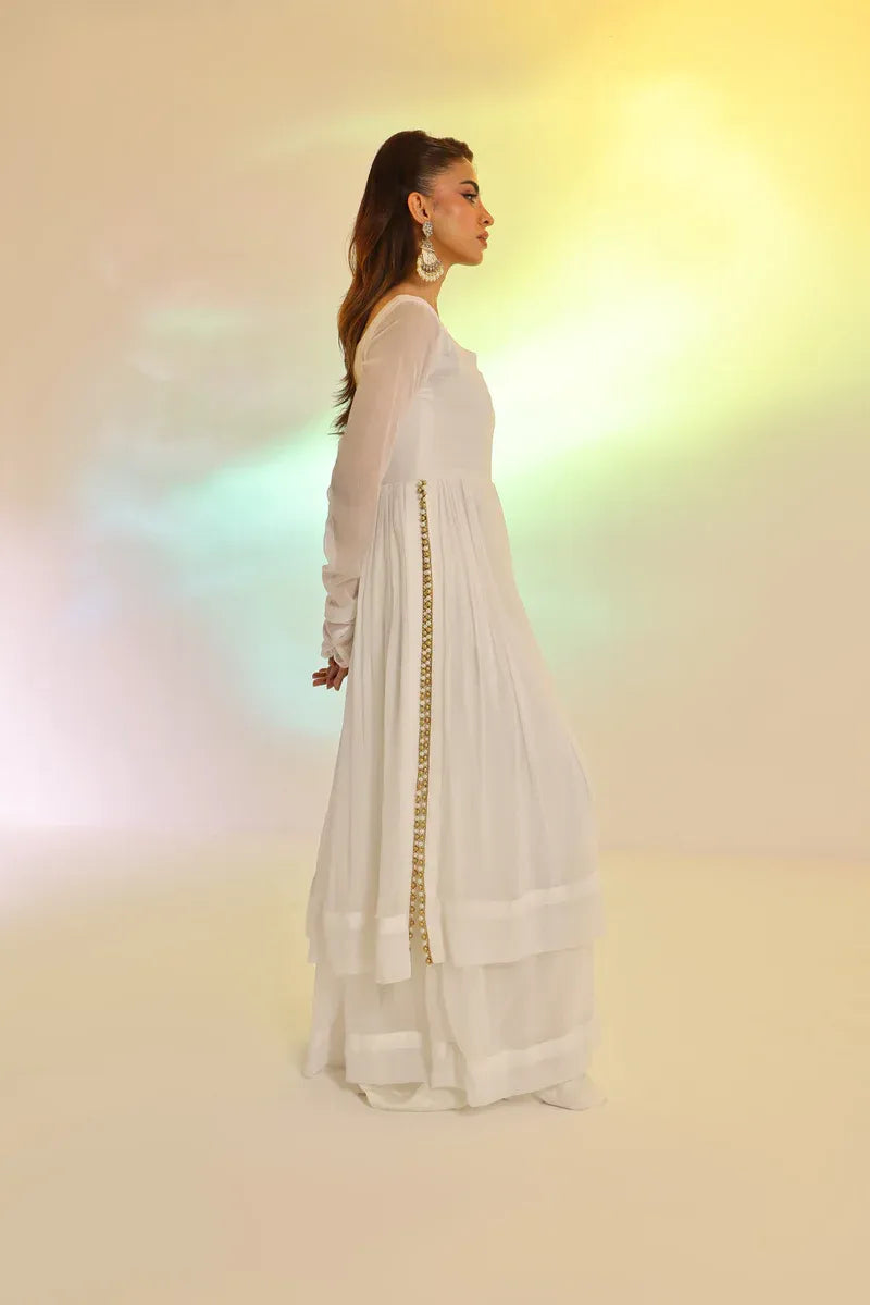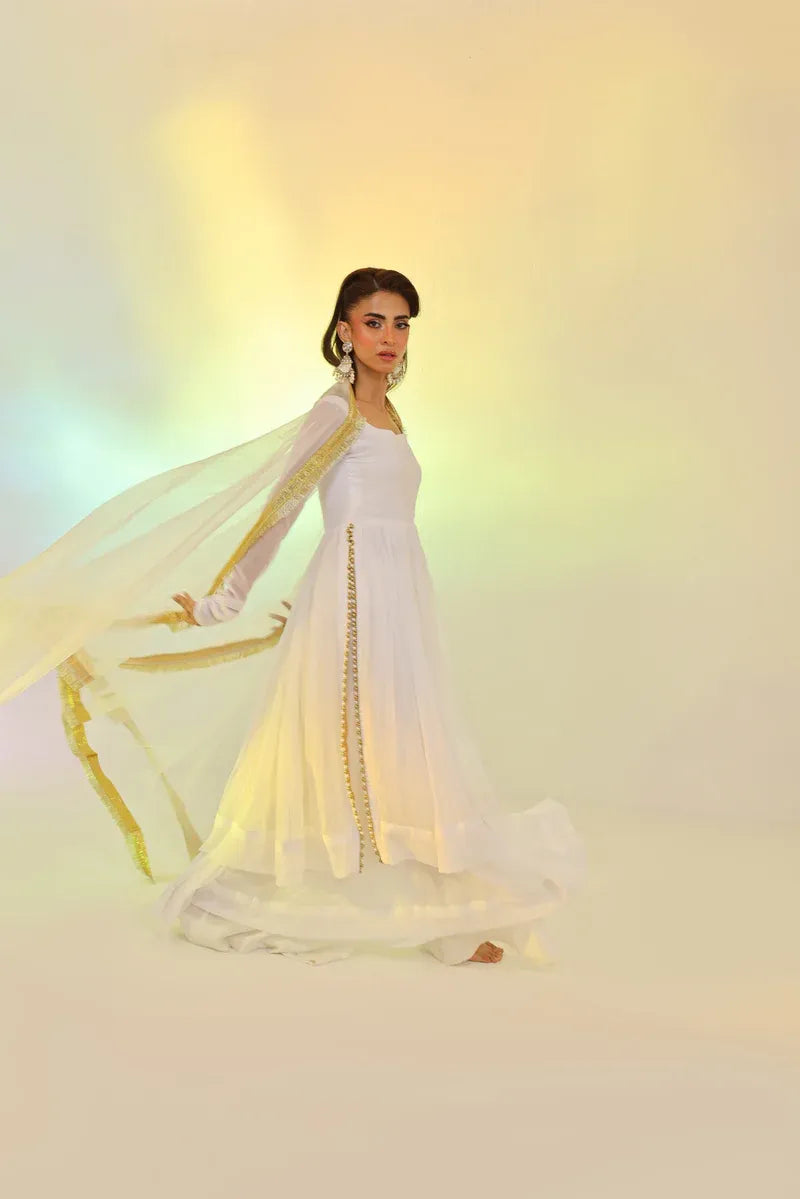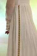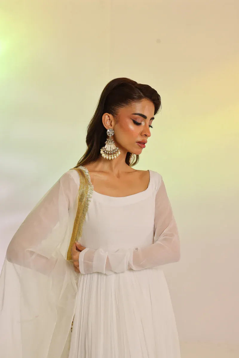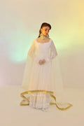 This Flowy set features a crinkle chiffon frock with a remarkable two-tier design that imitates a shirt and lehenga, an incredible 250+ inches of flare, made with over 10 yards of fabric. Fully lined with Malayi fabric for comfort, this frock offers a voluminous and graceful silhouette. Paired with a soft organza dupatta, featuring a four-sided lace border, this ensemble is perfect for a sophisticated and flowing look.